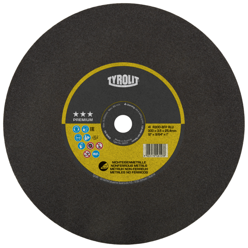 In order to cut nonferrous metals, the tool must have a high cutting ability. To this end, TYROLIT has developed a special formula and production method in order to be able to perform stationary cutting on NF metals too. New specifications prevent the clogging and dulling of the grinding wheel which used to be a common result of material abrasion. As with all TYROLIT PREMIUM*** cut-off wheels, this tool has been optimised to achieve the best possible cutting ability and lifetime. Show more Show less